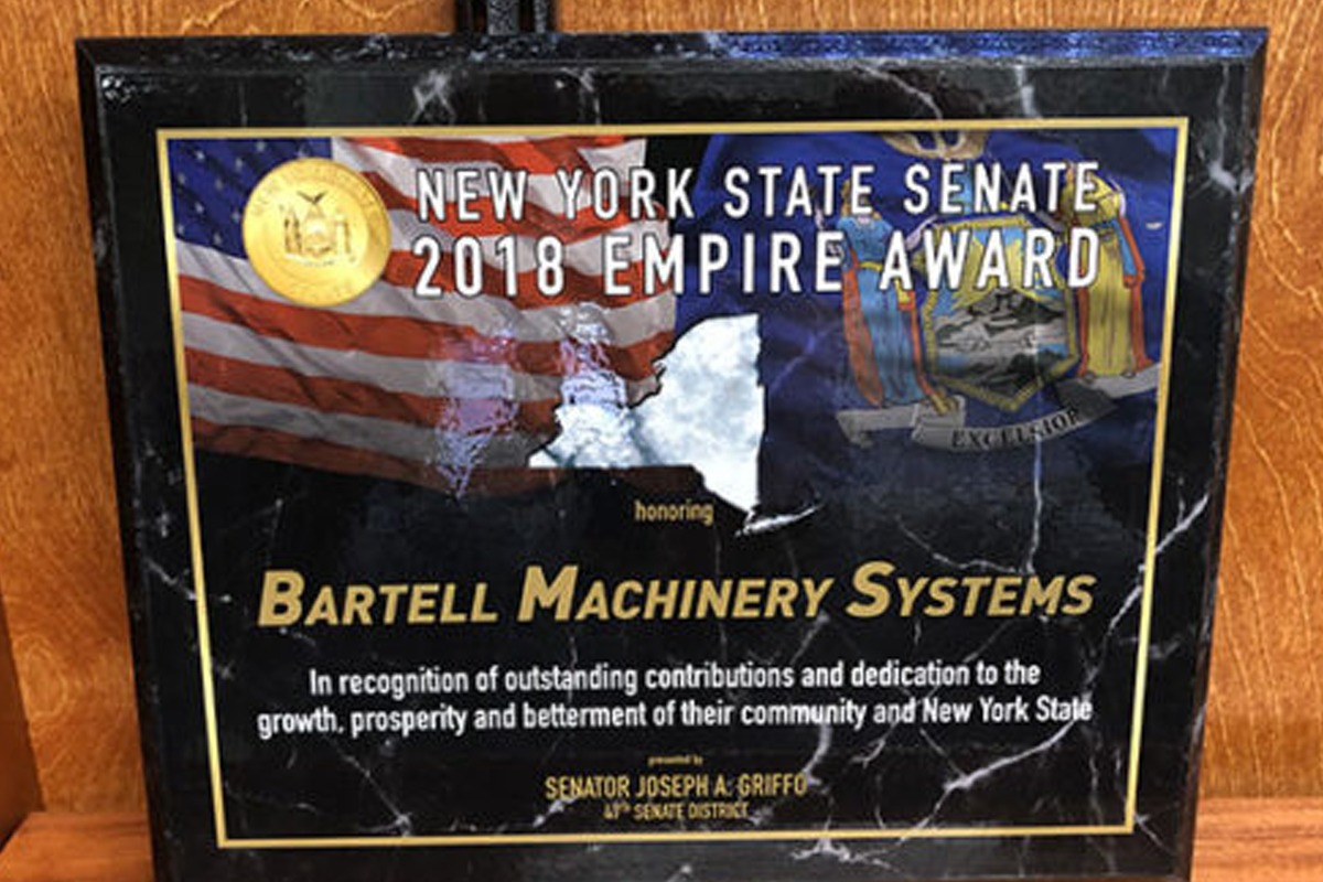Bartell was awarded the 2018 Empire State Senate Award by New York State Senator Joseph A. Griffo. The award recognizes Bartell’s contribution to the growth, prosperity, and betterment of the community.