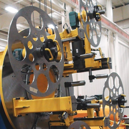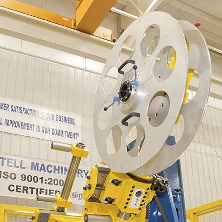 Two (2) or Four (4) Pad Taping Heads are suitable for the simultaneous application of two (2) or four (4) tapes onto a pipe surface in a layered spiral form with an open helix configuration. A heavy duty fabricated steel frame supports the rotating head assembly and the bore through the main frame is sized to allow a maximum passage of 600mm. A large lubricated bearing is mounted on the stationary portion of the main frame to create a rotating faceplate and a separate roller on a spring loaded swinging arm rides on the outside diameter of the tape pad to maintain constant tape tension during the run.