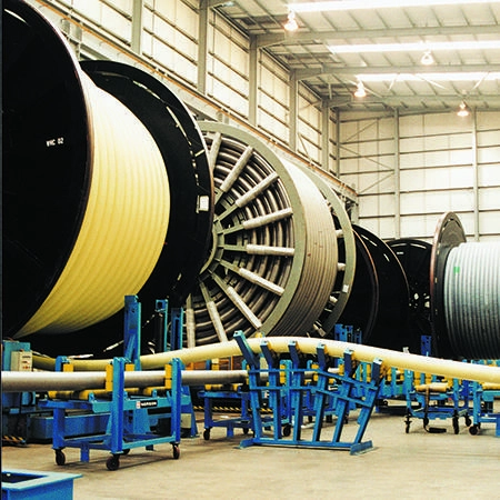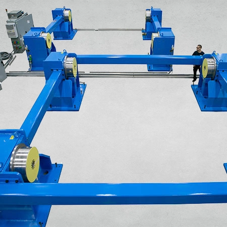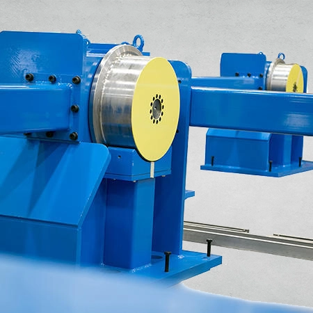 These units contain driven rim wheels which are fixed and are driven in tandem using two or four drive arrangements depending on the application. The rollers and their corner supports are connected by a cross brace system ensuring the stability of the unit. A total of eight (8) traverse wheels are included, four driven traverse wheels via one motor and gear reducer, allowing the under roller to traverse smoothly during spooling and unspooling operations. The traversing capability of the under roller can also be used to move from line to the next via rails mounted in the plant foundation. If operated as a take up unit a guide system is provided while for either pay off or take up operation a catenary dancer can be supplied.