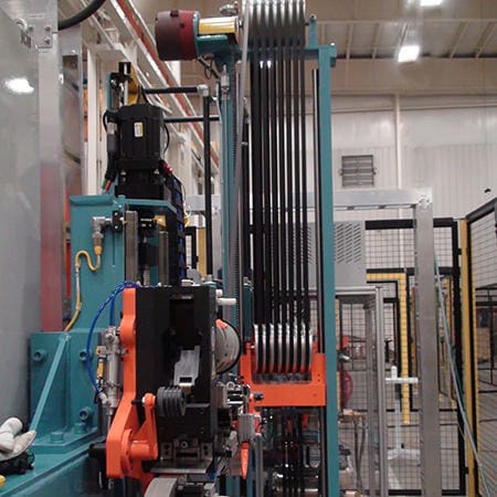 The Bartell TDS-860 Bead Line is an automatic bead winding machine designed to produce 10” (250mm) through 25” (635mm) passenger and light truck tire beads. The flat, weftless, insulated ribbon can contain anywhere from two (2) to twenty-four (24) single strands of bead wire with a maximum insulated ribbon width of 1.25” (32mm). The number of revolutions for a single bead profile can be adjusted from two (2) to twenty (20) turns and the machine has a maximum line speed of 500 ft/min (152.4 m/min), depending upon the size of the former fitted, operator skills, and the adhesion properties of the wire compound used.