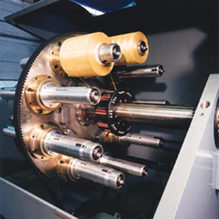 This strander is designed for the applying Aramid fibers over the cable. This design is available to suit a wide range of packages. Precise tension control is a feature of this design. A broken Aramid fiber detector will activate the line’s rapid stop deceleration in case of missing fiber bundle element.